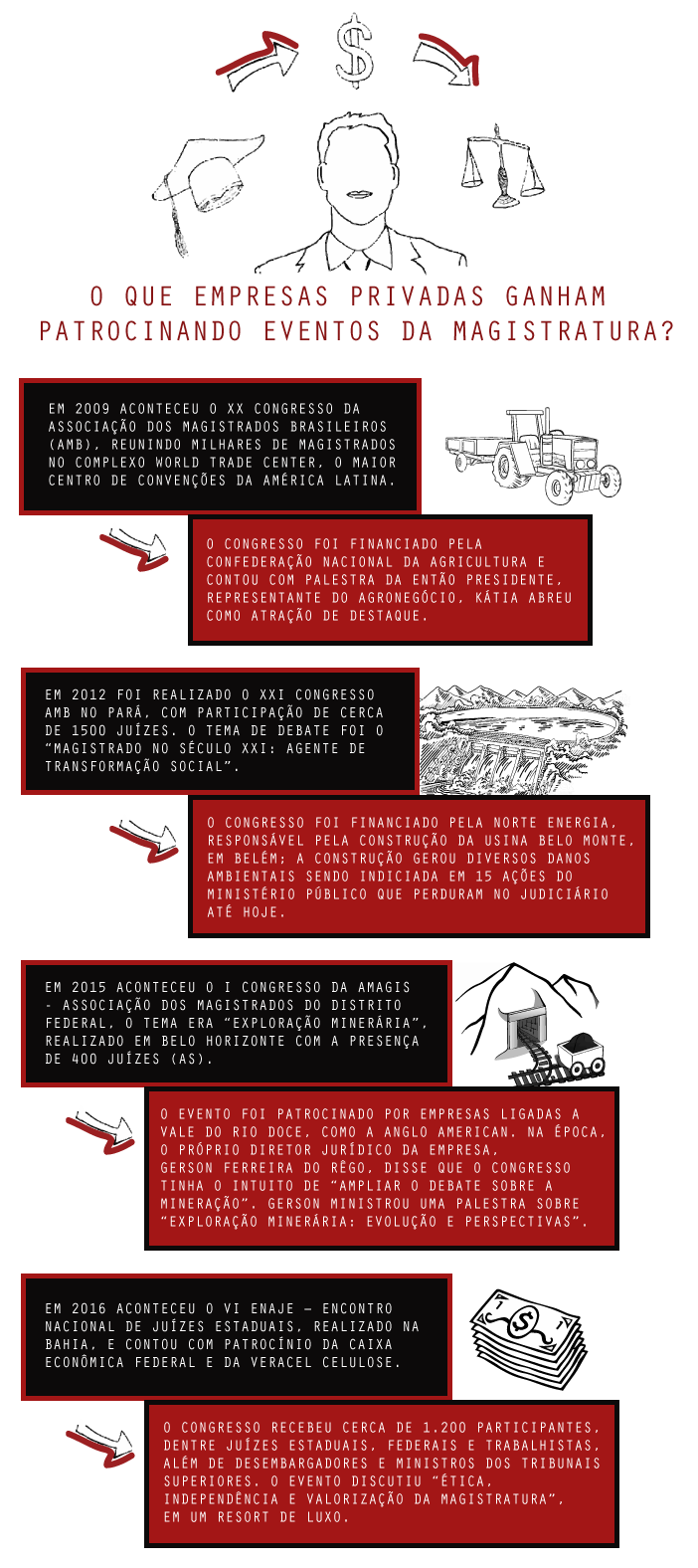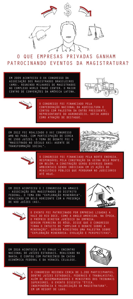 – Patrocínio de eventos da magistratura, por meio do qual as empresas financiam e participam ativamente de congressos, seminários e cursos para juízes, desembargadores e ministros;